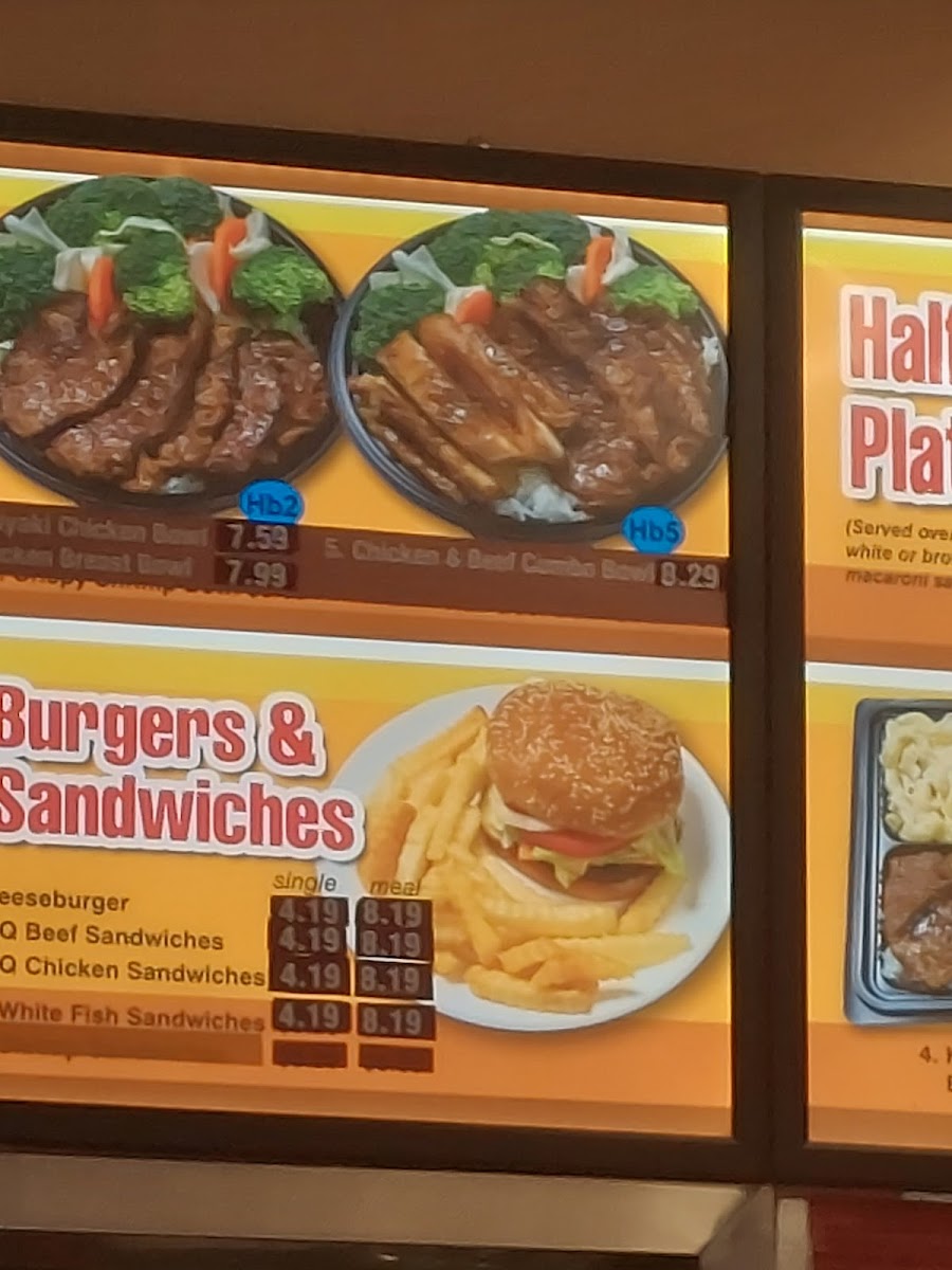 Served over choice of white or brown rice, macaroni salad, and steamed veggies.